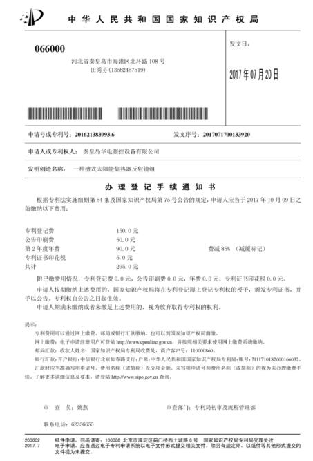 公司于2016年12月16日提交的“一種槽式太陽(yáng)能集熱器反射鏡組”(專利號(hào):201621383993.6)專利已被中華人民共和國(guó)國(guó)家知識(shí)產(chǎn)權(quán)局授予專利權(quán)。此項(xiàng)專利的授權(quán),標(biāo)志著公司已經(jīng)擁有39項(xiàng)自主知識(shí)產(chǎn)權(quán)。