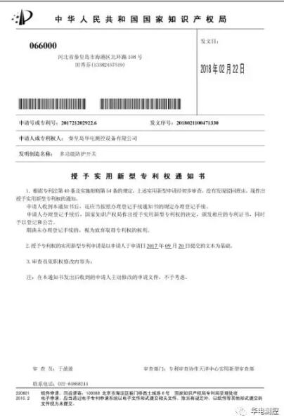 【企業(yè)要聞】公司申請(qǐng)的“多功能防護(hù)開關(guān)”專利授權(quán)