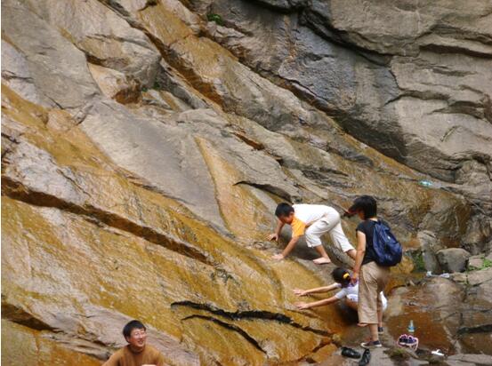 進入景區(qū),迎面就是景區(qū)管理站天泉山莊,山莊往前走就是一片原生態(tài)的天然美景,幽谷峰秀,天青水白,怪石流水。大家三五成群的結伴在山谷里前行,就像是行走在畫里一樣。道路兩旁是溪水和灌木,孩子們時不時蹲下用手去撩撥水里的小魚,大人們則一邊欣賞山色美景,一邊為孩子們照相留影。人們就這樣行走在湖光山色之間,大家一路游覽了古廟、仙人石、瀑布水潭等景觀。時間不知不覺的在人們愉快的交談和孩子們的嬉戲打鬧中過去了。臨近午后,大家三五成群的回到天泉山莊,并在那里午飯休息。男士吃飯喝酒氣氛熱烈,女士嘮家常、品服飾悠閑愜意。孩子們玩耍嬉戲樂而忘返。