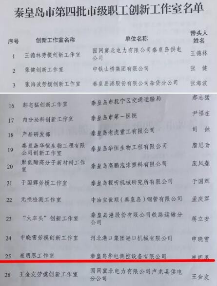 秦皇島華電測控設(shè)備有限公司“崔明思工作室”被秦皇島市勞動(dòng)競賽委員會(huì)命名為第四批市級(jí)職工創(chuàng)新工作室。