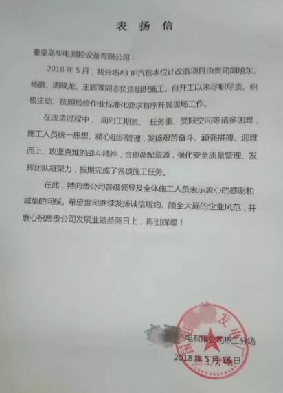 2018年5月18日,公司再次收到來自國電某發(fā)電廠的一封表揚信。信中,甲方對公司全體施工人員盡職盡責、積極主動、規(guī)范有序的態(tài)度和精神提出嘉許。信中提到:“在改造過程中,面對工期緊、任務重、受限空間等諸多因素,施工人員統(tǒng)一思想、精心組織管理,發(fā)揚艱苦奮斗、頑強拼搏、迎難而上、攻堅克難的戰(zhàn)斗精神,合理調配資源,強化安全質量管理、發(fā)揮團隊凝聚力,按期完成了各項施工任務。”