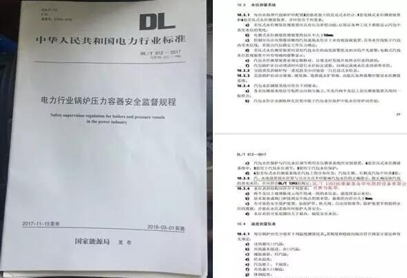 中華人民共和國(guó)電力行業(yè)標(biāo)準(zhǔn)《電力行業(yè)鍋爐壓力容器安全監(jiān)督規(guī)程》(DL/T 612-2017)(替代DL612-1996)于2017年11月15日由國(guó)家能源局發(fā)布,并于2018年3月1日實(shí)施。此規(guī)程規(guī)定了電力行業(yè)鍋爐壓力容器安全監(jiān)督要求,并在“10.安全保護(hù)裝置及儀表中10.3水位測(cè)量系統(tǒng)”引用了《火力發(fā)電廠鍋爐汽包水位測(cè)量系統(tǒng)技術(shù)規(guī)程》(DL/T1393-2014)部分內(nèi)容進(jìn)行系統(tǒng)闡述。