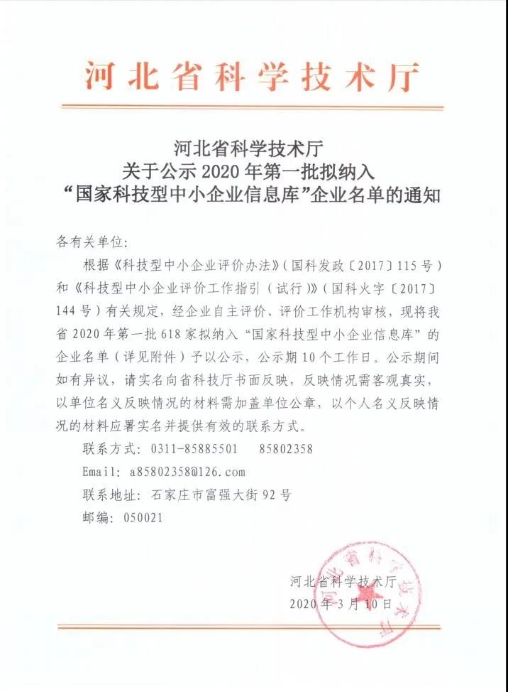 近日,河北省科技廳根據(jù)《科技型中小企業(yè)評(píng)價(jià)辦法》(國(guó)科發(fā)政【2017】115號(hào))、《科技型中小企業(yè)評(píng)價(jià)辦法工作指引(試行)》(國(guó)科火字【2017】144號(hào))要求,公示通過河北省2020年第一批“科技型中小企業(yè)”名單。我公司憑借在企業(yè)科技創(chuàng)新領(lǐng)域的成就成功入選,入庫登記編號(hào):202013030209000247。