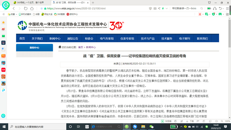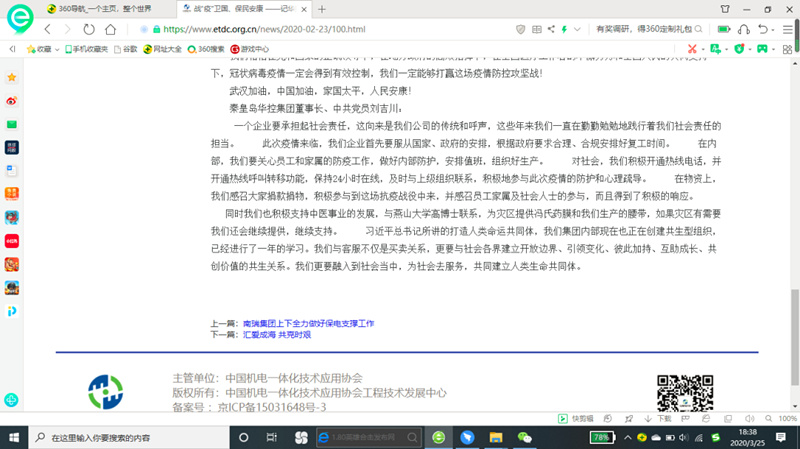 春節(jié)前夕,突如其來的疫情影響了整個(gè)中國(guó),在這場(chǎng)戰(zhàn)“疫”面前,人人有責(zé),華控集團(tuán)作為一家負(fù)責(zé)任、有擔(dān)當(dāng)?shù)拿駹I(yíng)企業(yè),積極貢獻(xiàn)了自己的力量!關(guān)于華控集團(tuán)《戰(zhàn)“疫”為國(guó),保民安康》的通訊報(bào)道在中國(guó)機(jī)電一體化技術(shù)應(yīng)用協(xié)會(huì)工程技術(shù)發(fā)展中心網(wǎng)站刊登,對(duì)我公司在此次戰(zhàn)役做的貢獻(xiàn)進(jìn)行了肯定。大災(zāi)面前,應(yīng)有大愛,這場(chǎng)戰(zhàn)役面前,人人有責(zé)。但要怎么做、如何做,離不開一個(gè)積極向上公司正向的引導(dǎo),在這里我想華控集團(tuán)給我們做了一個(gè)很好的榜樣,讓我們知道了什么是責(zé)任、什么是擔(dān)當(dāng)、什么是大愛。