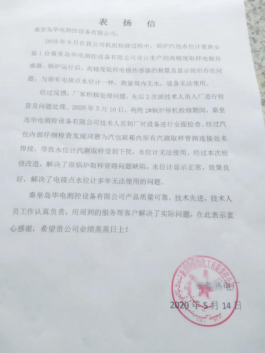 2020年5月15日,華電測控收到來自新疆某化工有限公司的表揚信,表揚我公司解決了該廠鍋爐汽包電接點水位計多年無法使用的問題。信中對我公司的產品質量、全新全意為客戶服務的理念以及技術人員認真負責的工作態(tài)度均給予肯定。