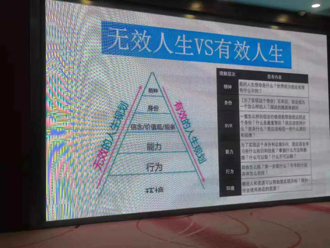 首先,劉老師將“有效人生”和”無效人生”進行了對比。隨后,劉老師就“精神、身份、信念、能力、行為、環(huán)境”等幾個方面提出了問題,引導(dǎo)我們思考。