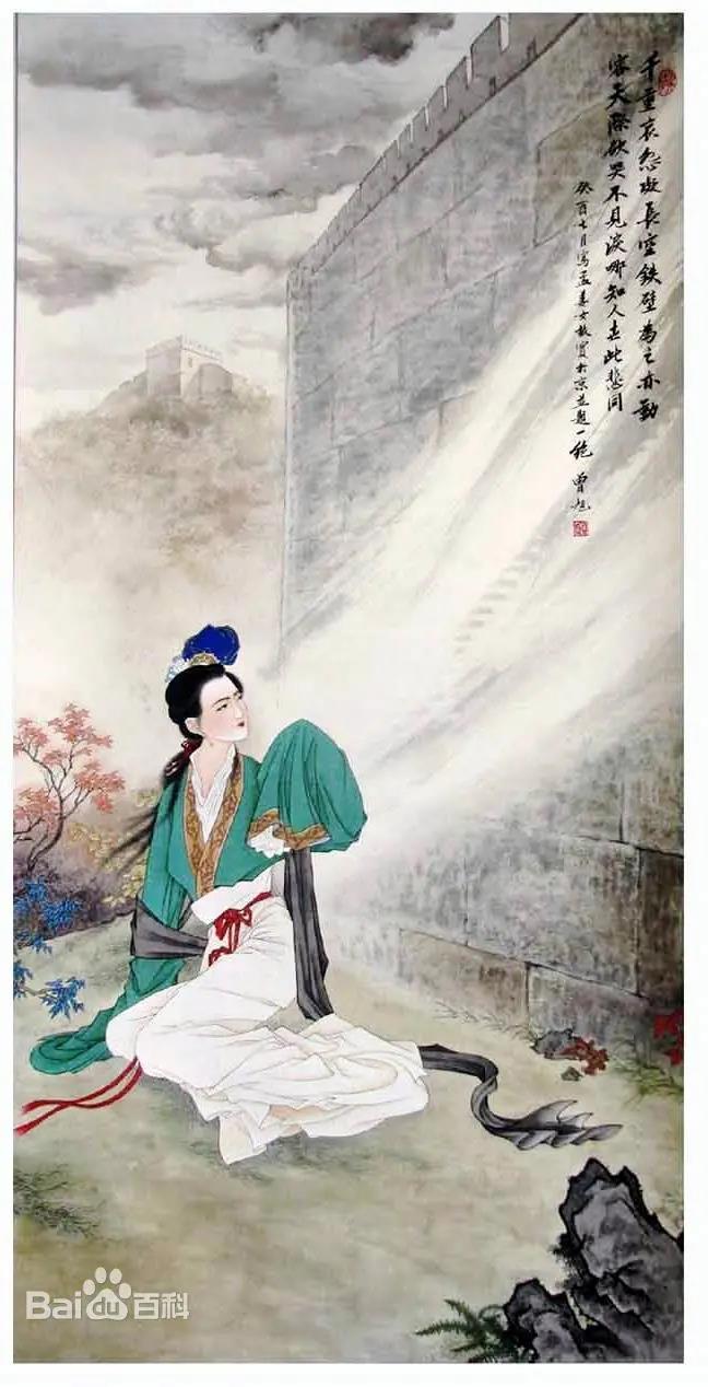 一夜之間,做好棉衣,孟姜女千里迢迢,踏上路程。一路上跋山涉水,風(fēng)餐露宿,不知饑渴,不知勞累,晝夜不停地往前趕,這一日終于來到了長城腳下。可長城下民夫數(shù)以萬計,到哪里去找呢?她逢人便打聽,好心的民夫告訴她,范喜良早就勞累致死,被埋在長城里筑墻了。孟姜女一聽,心如刀絞,便求好心的民工引路來到了范喜良被埋葬的長城下。坐在城下,孟姜女悲憤交加:想自己千里尋夫送寒衣,盡歷千難萬險,到頭來連丈夫的尸骨都找不到,怎不令人痛斷柔腸。愈想愈悲,便向著長城晝夜痛哭,不飲不食,如啼血杜鵑,望月子規(guī)。這一哭感天動地,白云為之停步,百鳥為之噤聲。直哭了七天七夜,忽聽轟隆隆一陣山響,一時間地動山搖,飛沙走石,長城崩倒了八百里,露出范喜良的尸骨。