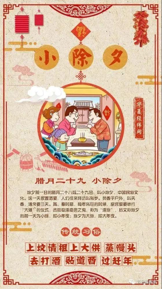 除夕前一日的臘月二十八或二十九日,叫小除夕,中國(guó)民俗文化。這一天家置酒宴,人們往來(lái)拜訪叫別歲。焚香于戶(hù)外,叫天香,通常要三天。