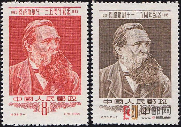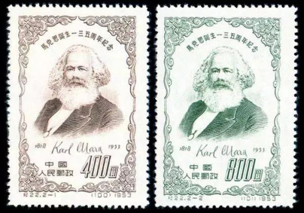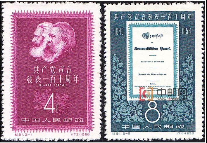 1958年7月1日,原郵電部發(fā)行紀(jì)51《共產(chǎn)黨宣言發(fā)表一百一十周年》紀(jì)念郵票,全套2枚,由孫傳哲設(shè)計(jì),中國近代印刷公司雕刻版印刷。其中第一枚“馬克思和恩格斯像”,面值4分。圖案為充滿睿智、蓄著胡須的馬克思和恩格斯側(cè)面像。