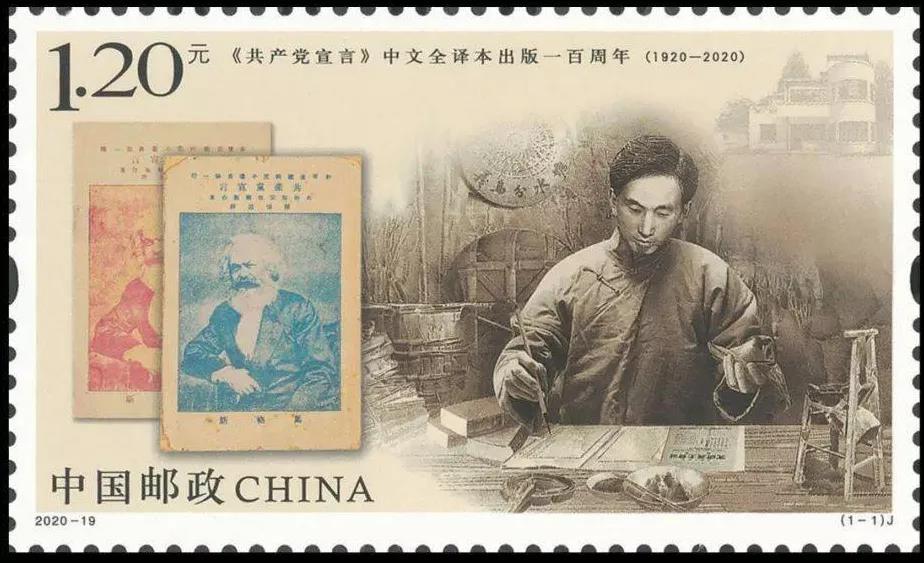 我需要介紹2020年發(fā)行的紀(jì)念郵票:紅印和藍(lán)印馬克思半身肖像的《共產(chǎn)黨宣言》中文全譯本早期版本書影,透射著這本“小冊(cè)子”穿越百年的真理光芒;用鉛筆繪制的陳望道還是未及“三十而已”的年輕模樣,一手奮筆疾書,一手拿著沾了墨汁的粽子,“柴屋勤譯”的場(chǎng)景被高度還原;右上角,位于上海市楊浦區(qū)國福路51號(hào)的《共產(chǎn)黨宣言》展示館(陳望道舊居)見證著他在復(fù)旦長期工作的歲月和復(fù)旦人對(duì)老校長故事的代代講述、對(duì)“宣言精神”的忠實(shí)傳承……