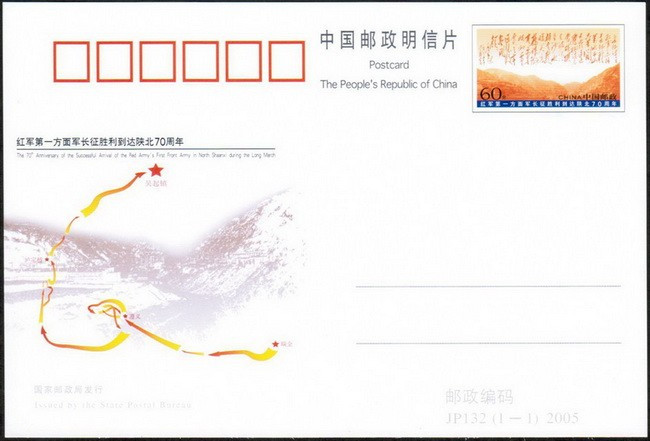 2005年10月19日,在紅一方面軍到達(dá)陜北吳起鎮(zhèn)70周年紀(jì)念日到來之際,國家郵政局曾發(fā)行JP132《紅軍第一方面軍長征勝利到達(dá)陜北70周年》紀(jì)念郵資明信片1套1枚,郵資片的郵資圖案為毛澤東的《七律?長征》詩,郵資片主圖為紅一方面軍長征路線簡圖,路線圖起點(diǎn)是瑞金,終點(diǎn)為陜北吳起鎮(zhèn)。這枚紀(jì)念郵資明信片的發(fā)行,從側(cè)面證實(shí)了長征題材第一套郵票,紀(jì)念的是紅一方面軍勝利完成二萬五千里長征二十周年。