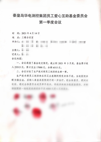 本次會(huì)議有兩項(xiàng)內(nèi)容,首先由愛心互助基金委員會(huì)執(zhí)行秘書張樂通報(bào)了基金收支情況。隨后由基金管理委員會(huì)主任李磊介紹了生產(chǎn)技術(shù)部員工趙洪林生病一事。生產(chǎn)技術(shù)部員工趙洪林在雙遼出差期間感覺身體不適,當(dāng)?shù)蒯t(yī)院診斷為腦出血,后轉(zhuǎn)入秦皇島醫(yī)院進(jìn)行進(jìn)一步治療。最后經(jīng)全體委員、顧問討論后,通過全體委員會(huì)成員舉手表決,將趙洪林納為輕度腦損傷,并酌情按照第一檔輕度疾病類給予其 4000 元愛心互助基金。