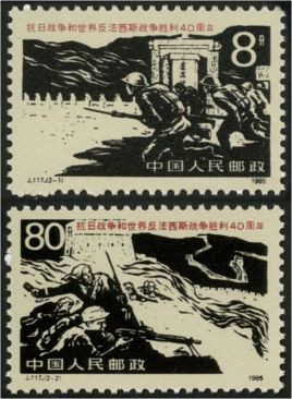 第三枚,七七戰(zhàn)火。1995年9月3日發(fā)行了《抗日戰(zhàn)爭及世界反法西斯戰(zhàn)爭勝利50周年》紀(jì)念郵票的首枚,這枚影寫版郵票長40毫米,寬30毫米,面值10分,何潔、陳楠、馮小紅聯(lián)合設(shè)計(jì)。郵票主圖以黑白照片資料取舍加工,以靜態(tài)為主,定格了中國守軍的盧溝橋頭嚴(yán)陣以待、抗擊日寇的歷史場(chǎng)面。