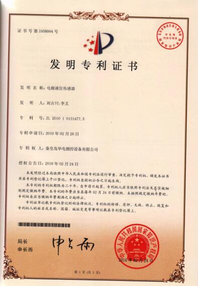公司于2010年2月26日提交的“電極液位傳感器”發(fā)明專利申請,歷時六年,終被中華人民共和國國家知識產(chǎn)權(quán)局頒發(fā)發(fā)明專利證書。