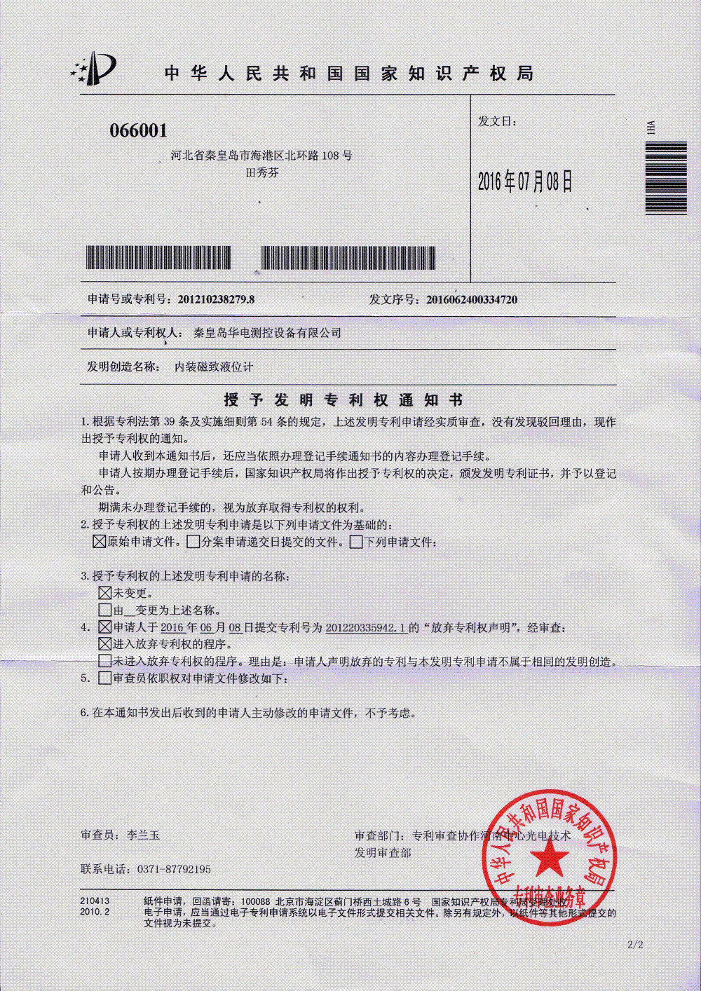 公司于2012年7月5日提交的“內(nèi)裝磁致液位計(jì)”專利已被中華人民共和國(guó)國(guó)家知識(shí)產(chǎn)權(quán)局授予發(fā)明專利權(quán),這標(biāo)志著公司在水位測(cè)量領(lǐng)域已經(jīng)擁有了5項(xiàng)發(fā)明專利。