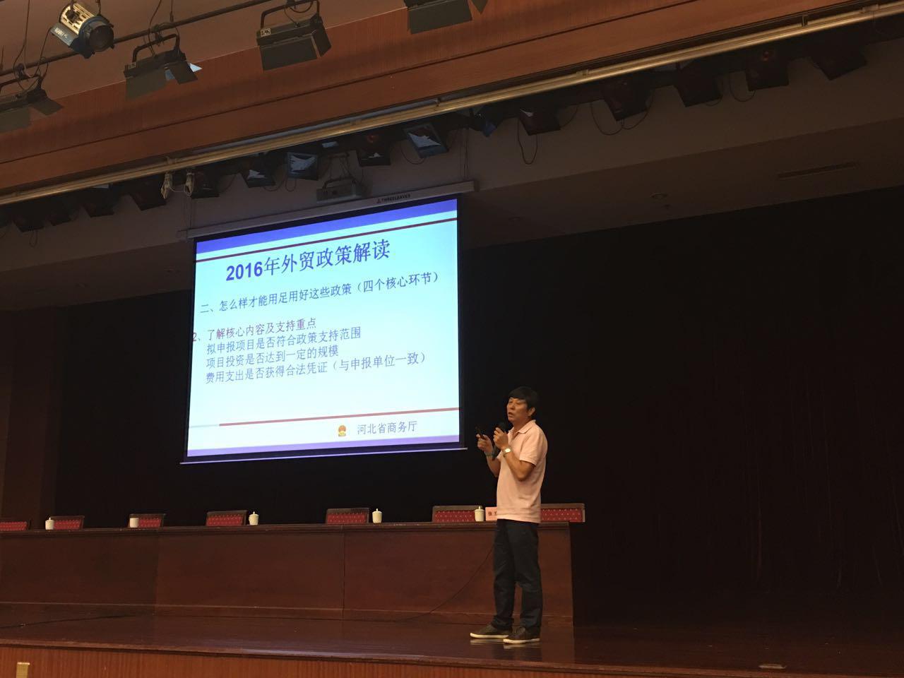 本次主題培訓(xùn)在秦皇島大酒店舉辦。培訓(xùn)的第一課是由省商務(wù)廳外貿(mào)處處長權(quán)奇衡解讀了國務(wù)院《關(guān)于促進(jìn)外貿(mào)回穩(wěn)向好的若干意見》和省政府辦公廳《關(guān)于 2016年全省外貿(mào)攻堅(jiān)行動(dòng)方案的通知》,他詳細(xì)解讀了國務(wù)院和我省為了加快培育外貿(mào)競爭新優(yōu)勢的相關(guān)政策;接下來來自省貿(mào)促會(huì)展覽部的王曉曼部長講解了出國展覽及國際市場開拓,她詳細(xì)地為大家講解了出國展覽的相關(guān)注意事項(xiàng)以及如何利用展覽去開拓國際市場;隨后省國稅局進(jìn)出口處副處長王翠蓮為我們解讀了出口退稅相關(guān)政策,介紹了退稅流程和相關(guān)最新退稅手續(xù);省外匯管理局經(jīng)常項(xiàng)目處主任科員于慶榮講解了貨物貿(mào)易外匯管理業(yè)務(wù);秦皇島海關(guān)稽查科科長王素素解讀了海關(guān)企業(yè)信用管理暫行辦法,同時(shí)中信保河北分公司處長助理孫東坡解讀了出口信保的相關(guān)政策;最后阿里巴巴秦皇島負(fù)責(zé)人賈東華為我們講述了“大數(shù)據(jù)讓中國外貿(mào)更美好”的課程,介紹了大數(shù)據(jù)時(shí)代的機(jī)遇與挑戰(zhàn)。