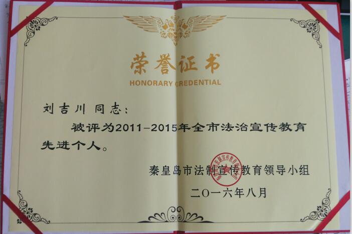 【企業(yè)要聞】喜訊: 華電測控總經(jīng)理劉吉川先生被評為2011-2015年全市法治宣傳教育先進(jìn)個(gè)人
